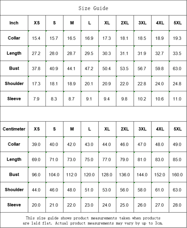 | Centimeter | XS | S | M | L | XL | 2XL | 3XL | 4XL | 5XL |