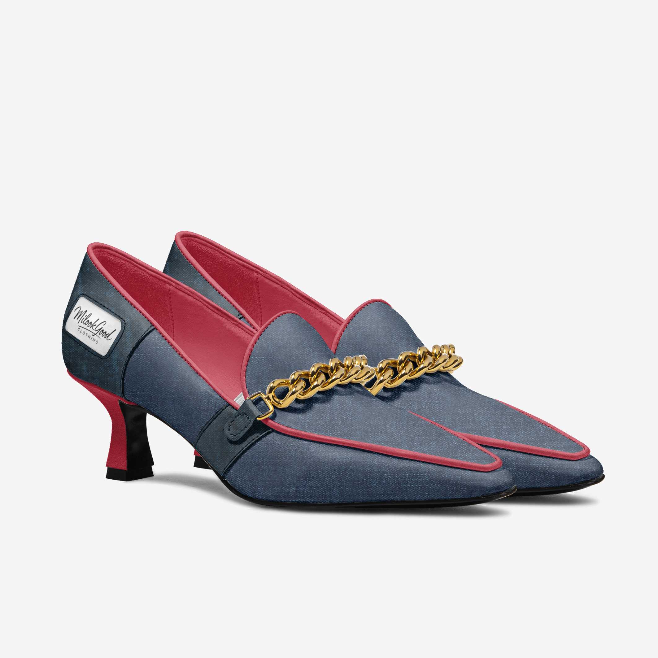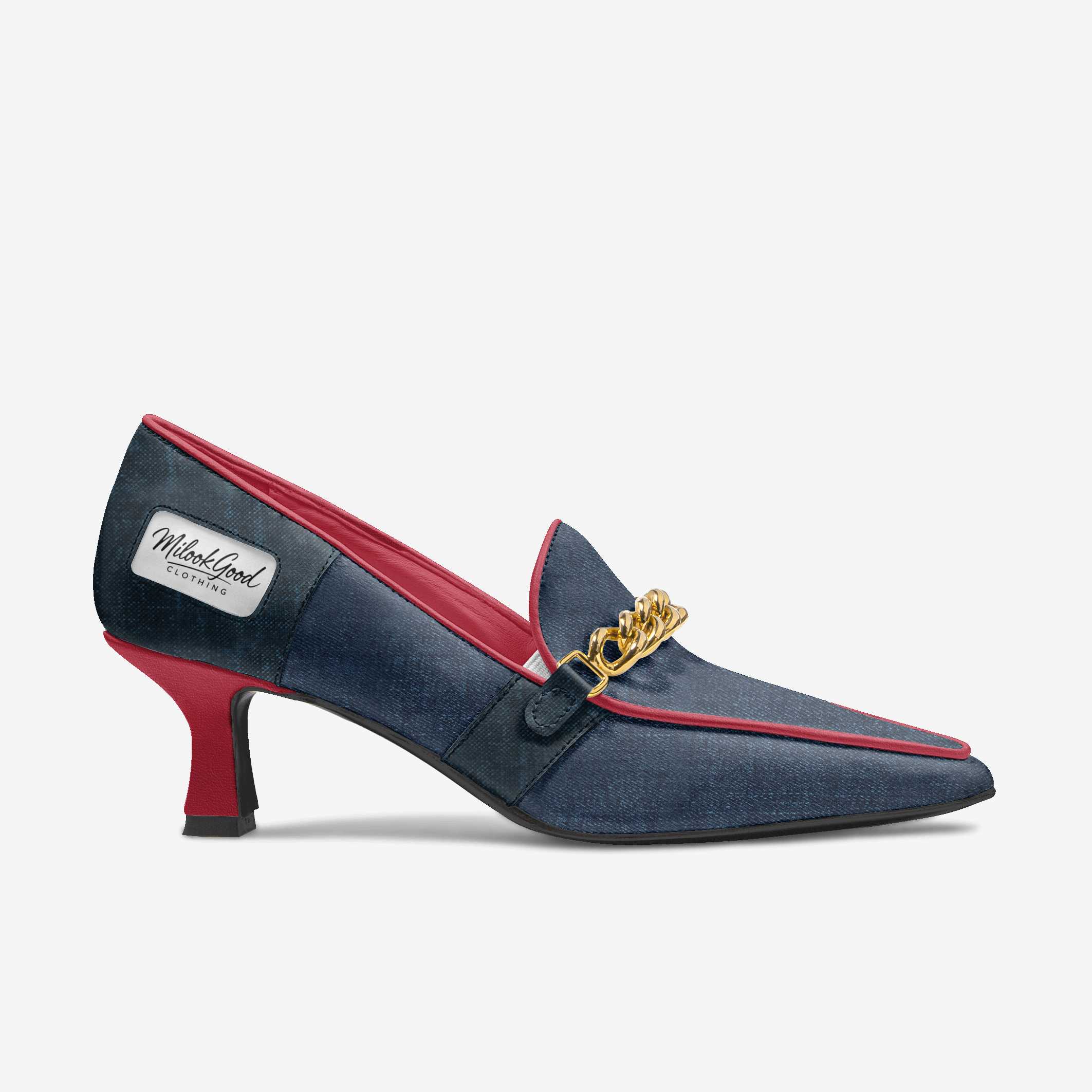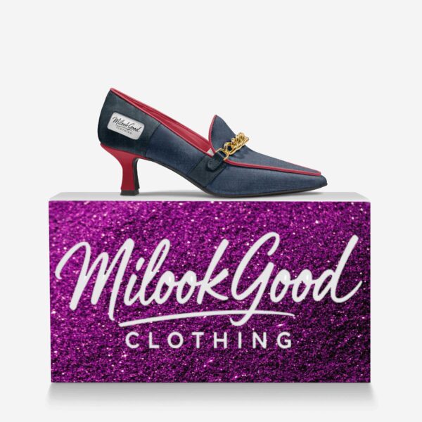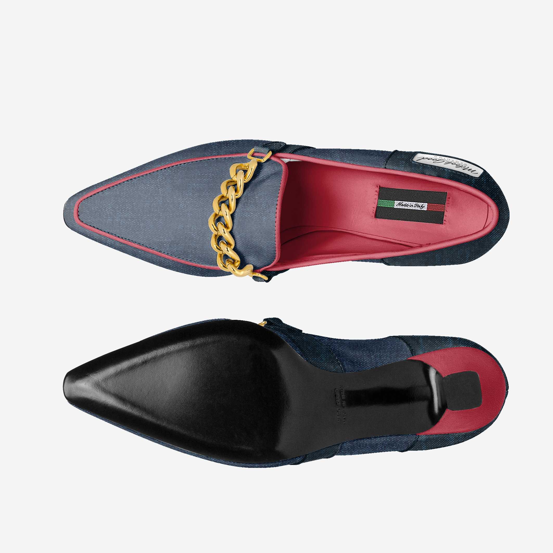 The CAMMINA showcases a striking fusion of soft red leather and innovative jeans-textured material, creating a contrast that feels both modern and timeless. Designed with meticulous craftsmanship, this style brings together playful creativity and elevated sophistication. The decorative golden chain adds a refined touch of luxury, enhancing the shoe’s bold character. With its thoughtful balance of comfort and fashion-forward design, the CAMMINA is a standout piece that embodies confident, contemporary elegance.