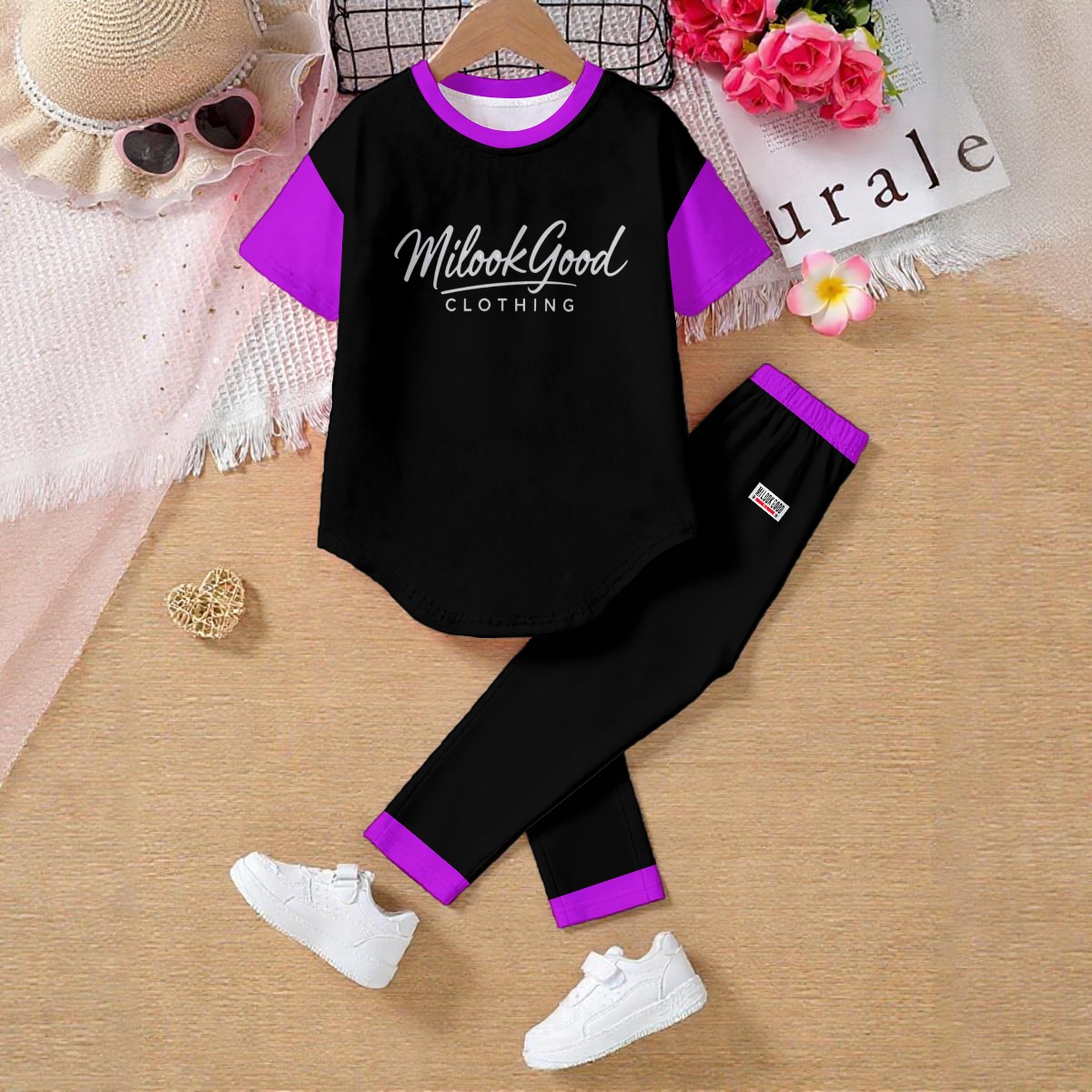 A comfortable and stylish two-piece set designed for everyday wear and active play. Crafted from soft, stretchy fabric, this set provides a smooth, breathable feel that’s gentle on the skin and perfect for all-day comfort. The T-shirt features a classic crew neckline with a subtly curved hem for a modern look, while the matching pants include an elastic waistband for an easy, secure fit.