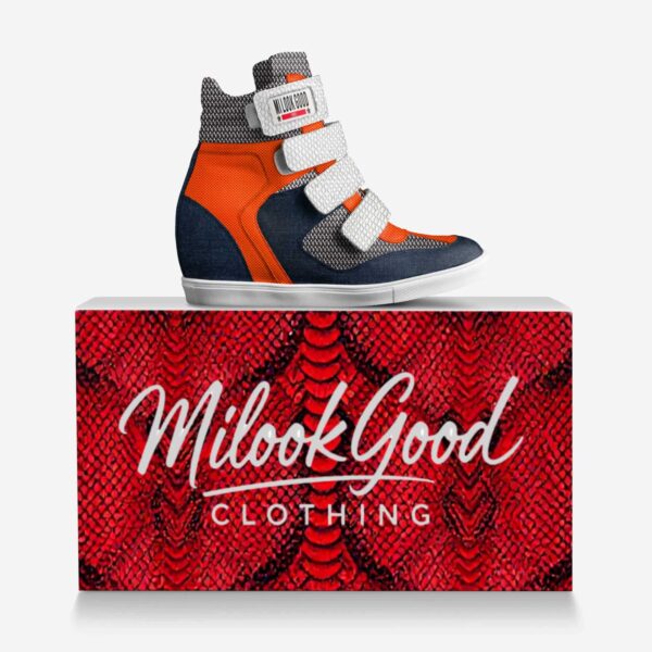 MIDNIGHT GLOW was made for women who light up every room without trying. This bold wedge sneaker merges futuristic femininity with sporty function — elevated by a glowing fusion of textyle orange and metallic silver materials, creating a radiant high-fashion statement.