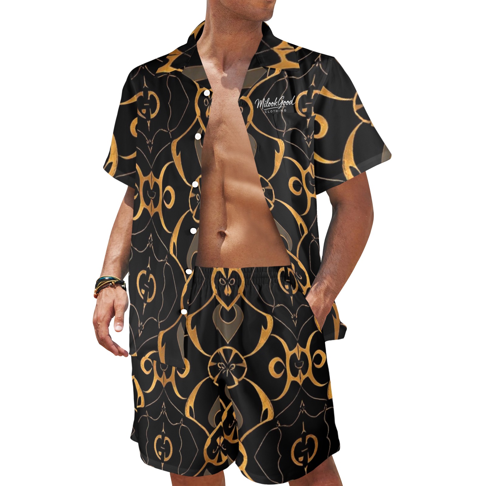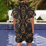 The Ocean Ease Summer Set combines effortless style with performance fabrics perfect for beach days or casual outings. Made from a lightweight, quick-drying four-way stretch blend of 94% polyester and 6% spandex, this set keeps you comfortable wherever your day takes you. The classic V-neck shirt features a button front and a handy chest pocket, while the matching beach shorts offer a relaxed fit with durable fabric and an adjustable white drawstring waistband.