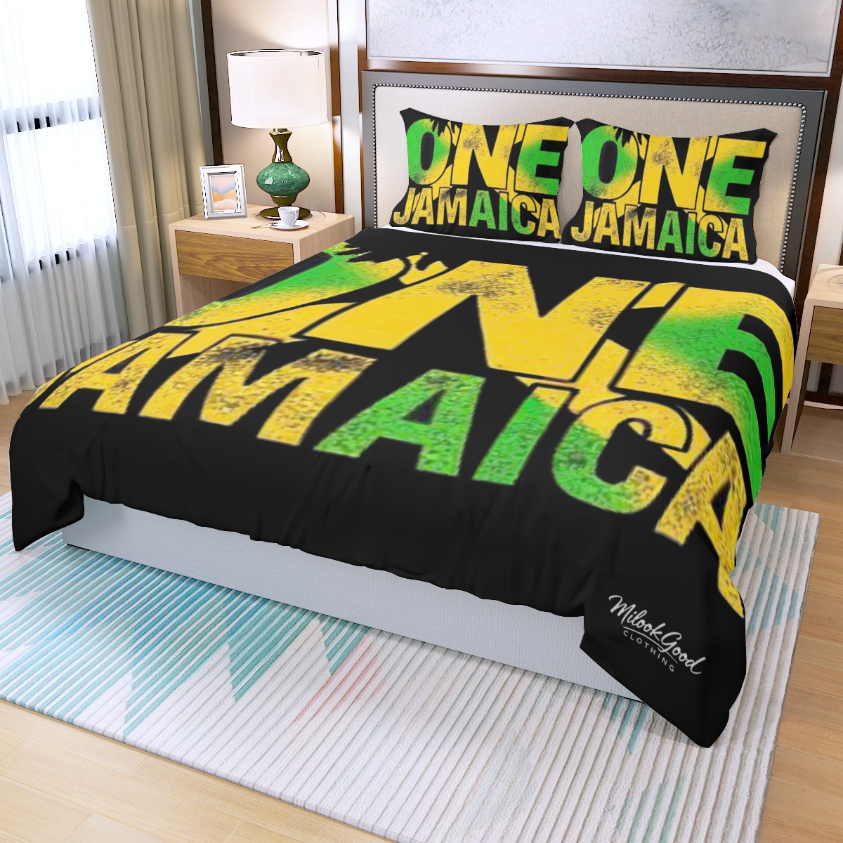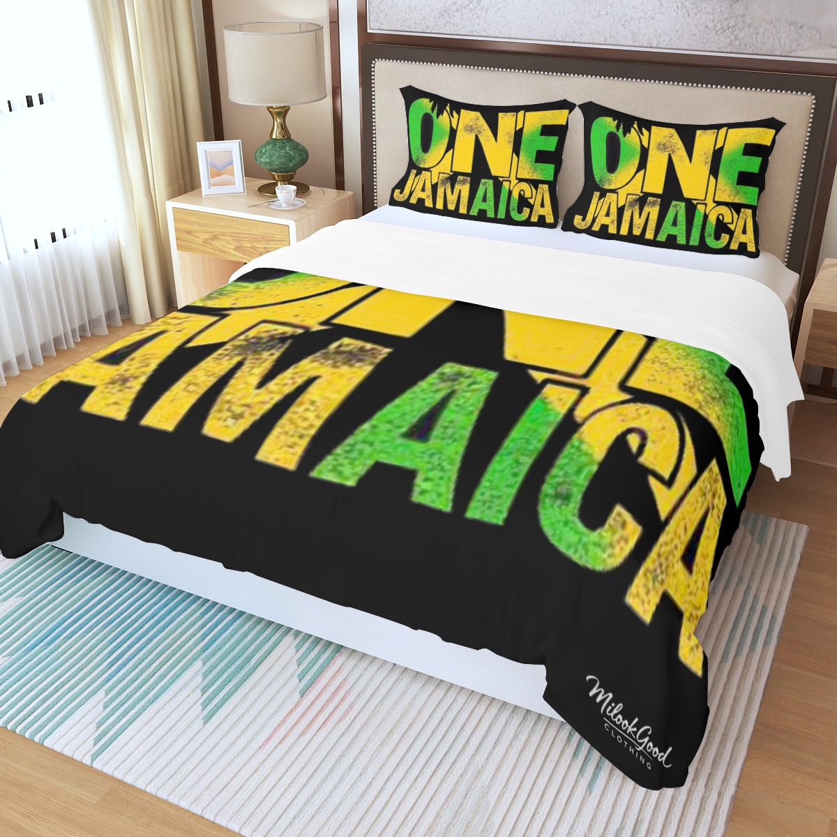 Celebrate Jamaica with bold colors and meaningful design in the Mi Look Good™ ONE Jamaica Duvet Bedding Set. Crafted to bring energy, style, and cozy comfort to your bedroom, this set is a perfect expression of pride and personality.