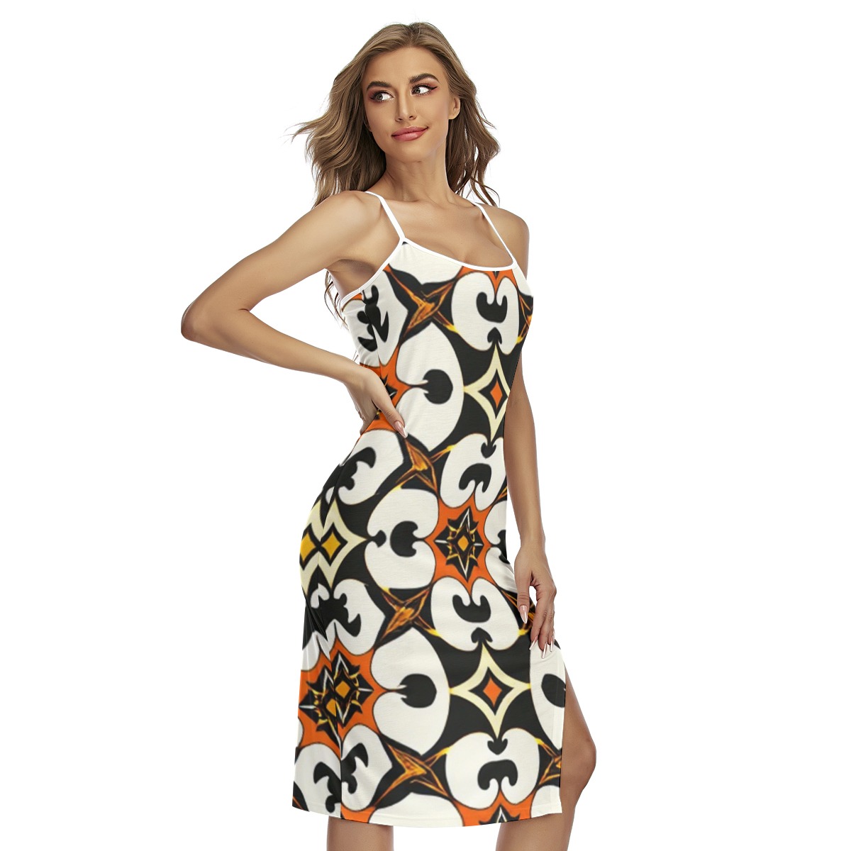 Turn heads in this sleek, body-hugging cami dress designed to accentuate your silhouette. Featuring delicate spaghetti straps that cross elegantly in the back and a side slit for a touch of allure, this piece blends sophistication and confidence in every step. Crafted from soft, stretchy jersey fabric for a smooth, second-skin feel.